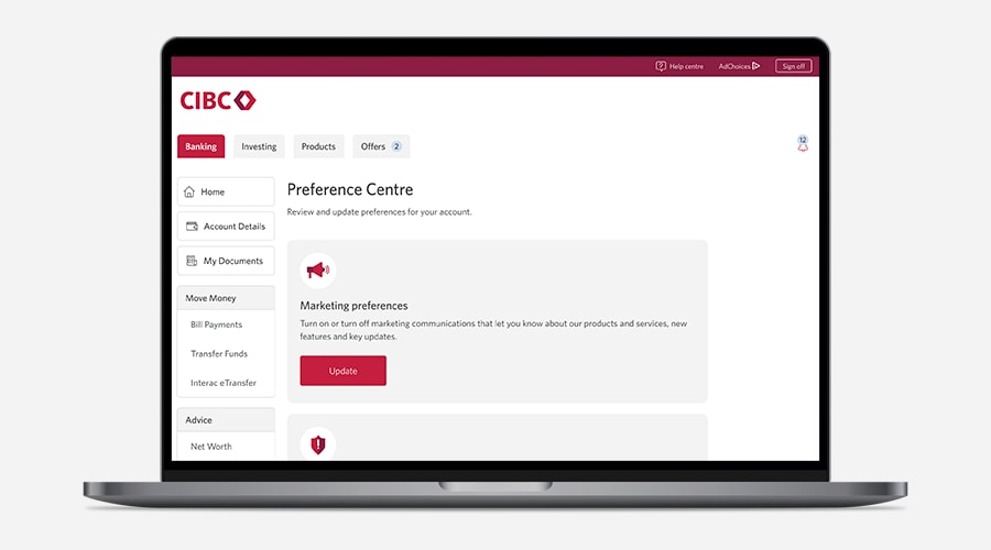 In addition to managing digital preferences, CIBC clients can also manage preferences related to marketing communications. Customize which CIBC marketing communications you receive across different delivery methods, including email, text and more.