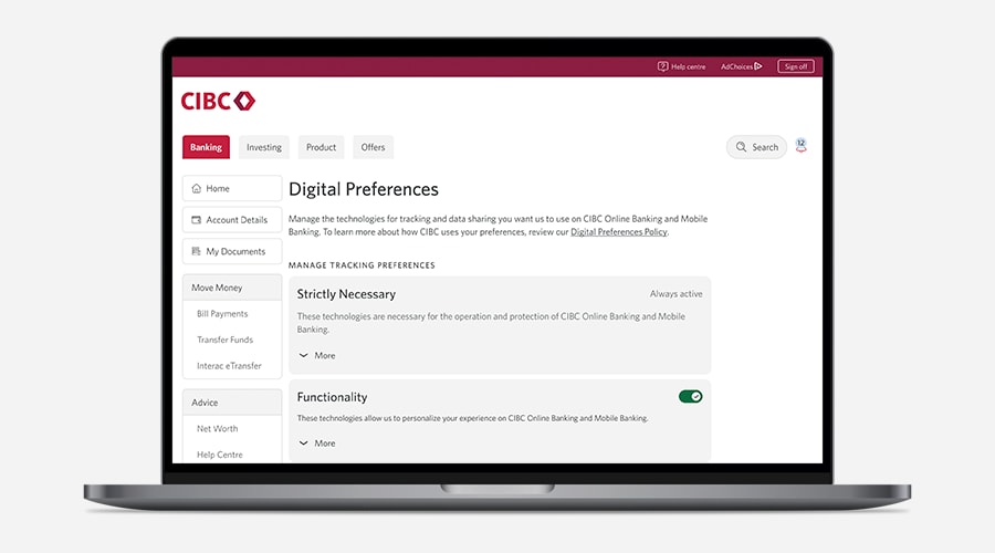 To maximize your choices and ensure anyone using CIBC sites or apps has these choices, we ensure you can manage your preferences regardless of whether you’re logged in.